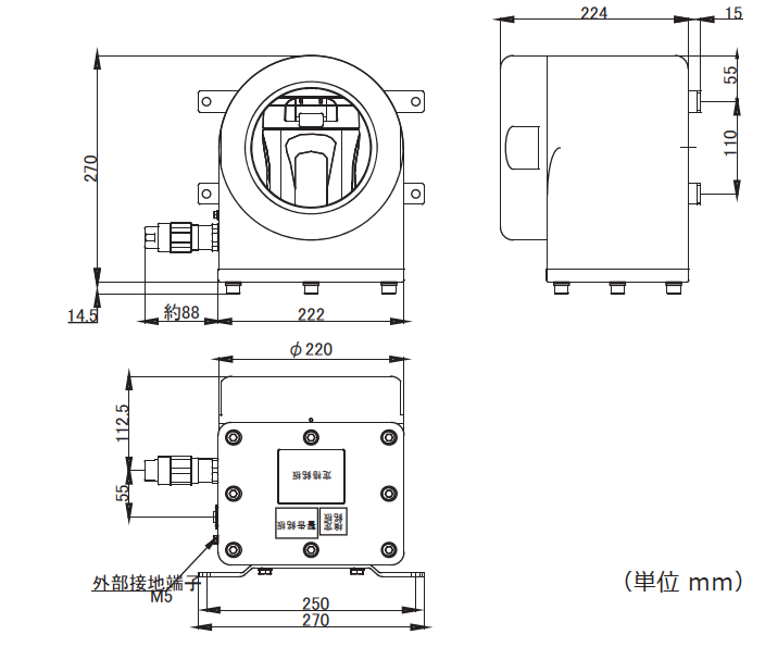 | 外形寸法 (W×H×D) | 270 × 270 × 239 ㎜ ※ケーブルグランド・突起部は含まず |