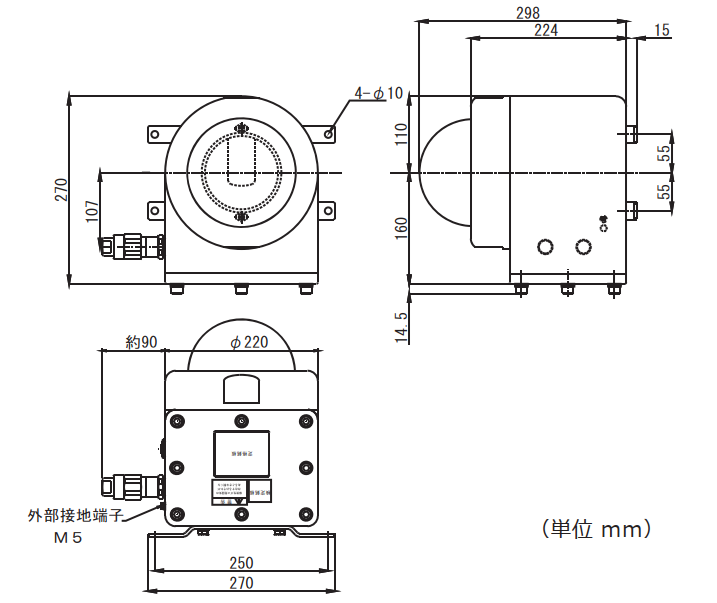 外形寸法 (W×H×D) 270 × 313 × 270 ㎜ ※ケーブルグランド・突起部は含まず